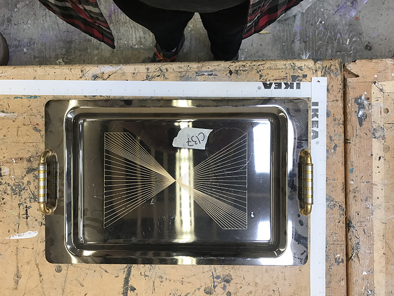 Silver rectangle serving tray with handles and patterend inlay